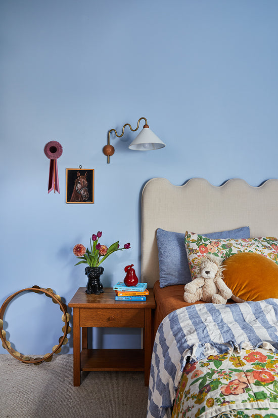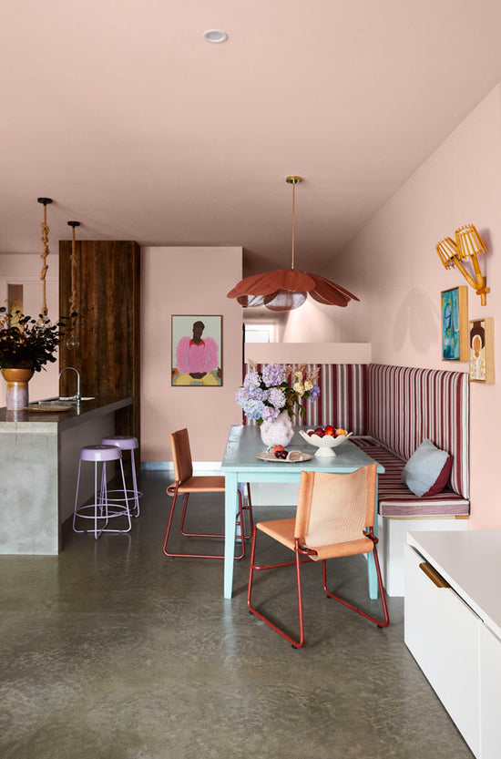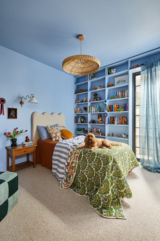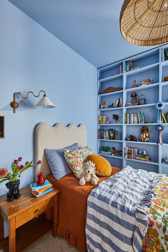 • Kid’s custom-designed wardrobe and desk space with Laminex cabinetry, bronze handles, and a built-in pinboard by Nikki McGar Interiors.