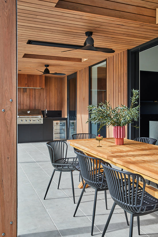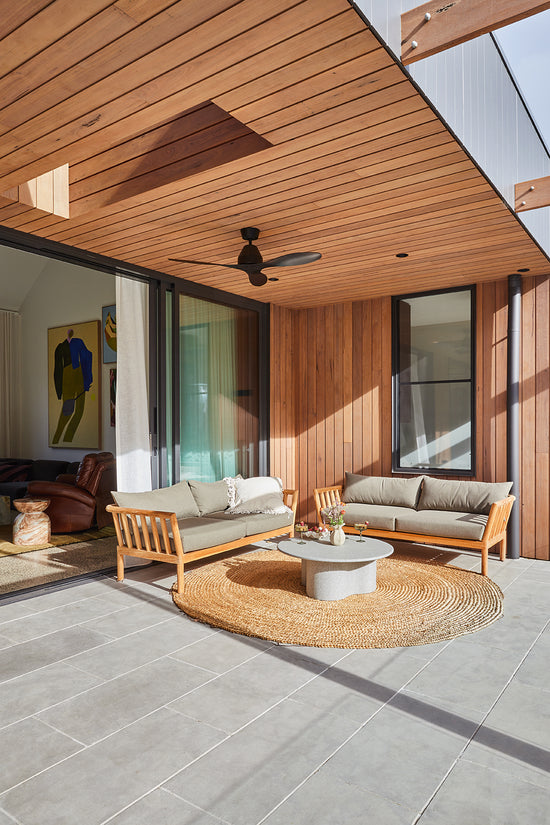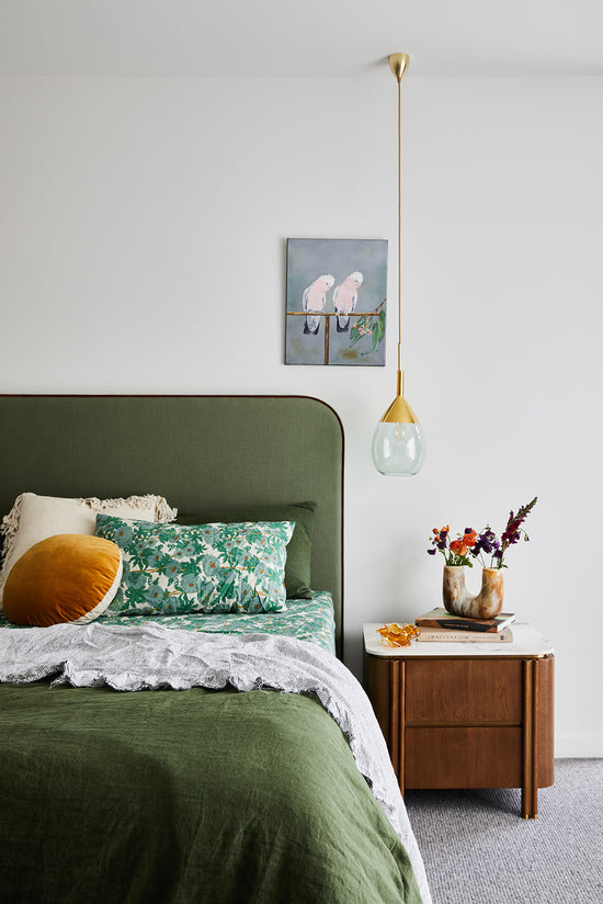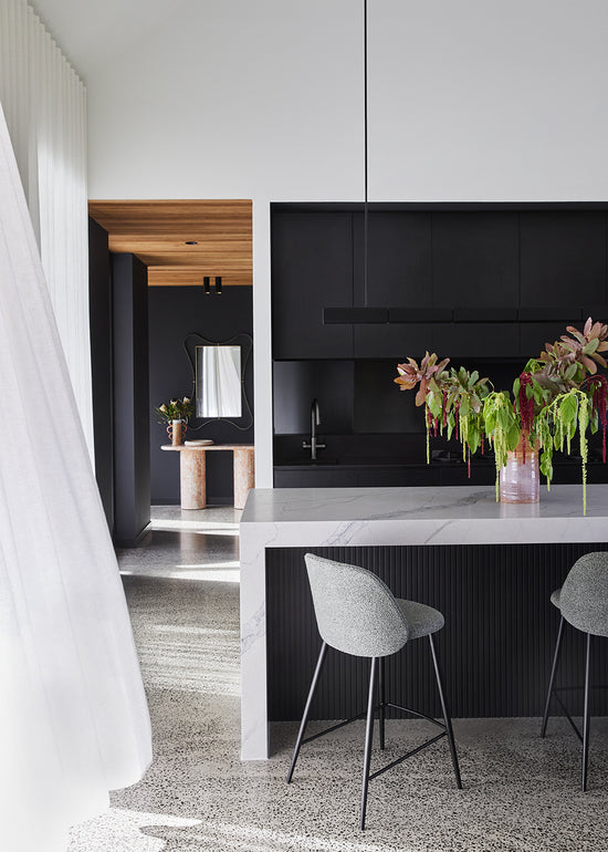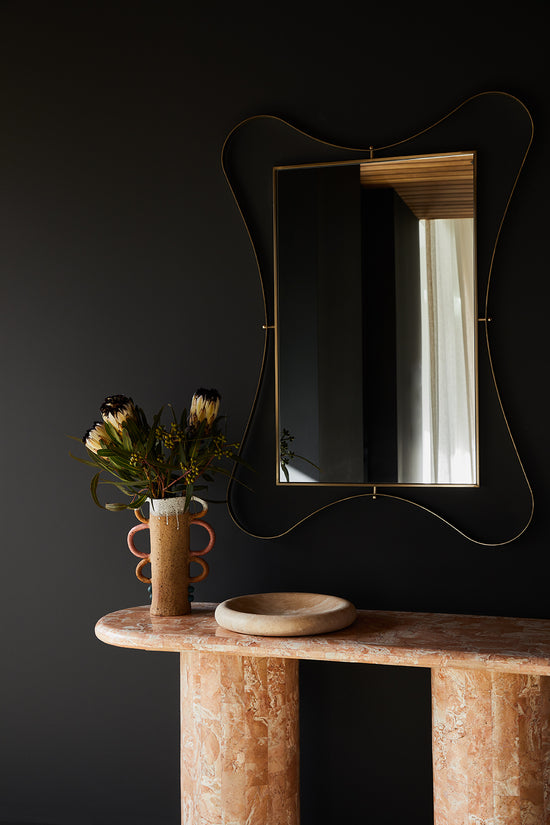 • Close-up of green marble coffee table with decorative styling by Nikki McGar Interiors on green rug